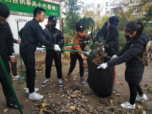 在校物业公司副总经理杨文杰老师、绿化保洁部经理张革艳老师、住宅服务部经理朱东方老师等的带领下,同学们拿着耙子、扫帚与塑料袋进行道路落叶清理。从一开始略有笨拙地使用工具到熟练,同学们只用了很短的时间,便进入正轨。很多新生是第一次接触志愿服务活动,感到很新奇,虽然有点累,但是仍仔细认真清理每个角落和路面杂物,经过一个多小时的共同努力,有效改善了道路的卫生环境情况。
