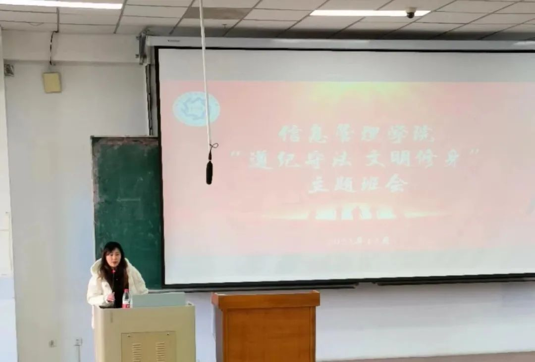 为倡导“遵纪守法 文明修身”的理念,严肃校园纪律,促进校园文明建设,强化同学们的遵纪守法意识和文明素养,yl8858永利集团于12月11日至12月17日开展“遵纪守法 文明修身”主题班会,公司党委副书记赵丽明同各年级辅导员深入班级,带领同学们一起学习纪律规范,提升文明素养。本次“遵纪守法 文明修身”主题班会既是一次深入的思想教育,同时也是对《yl8858永利集团员工管理规定》(2023年9月修订)一次深入的学习。信管学子们通过本次主题班会,更加坚定贯彻“遵纪守法 文明修身”的理念,以高尚的品格斩除万难,以良好的素质奋进新的未来。