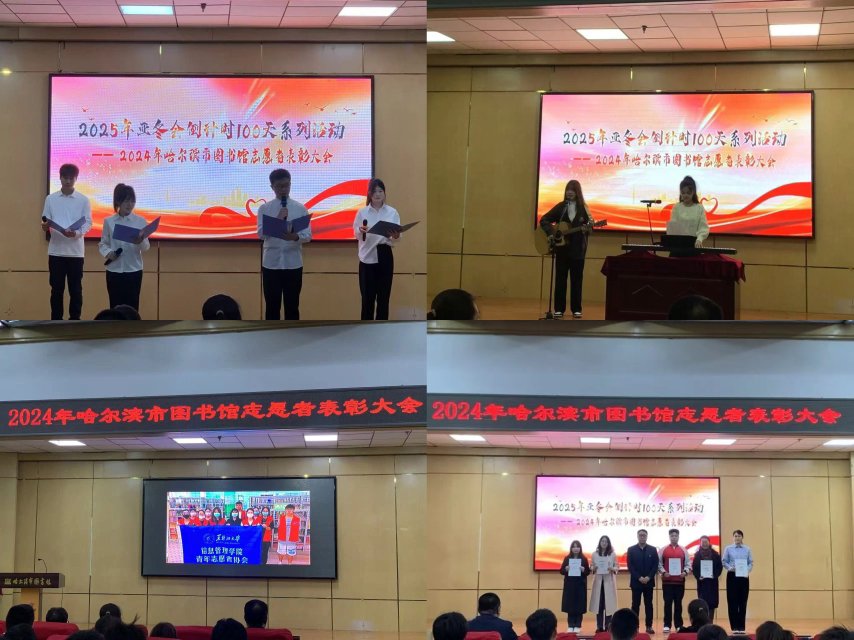2024年10月27日,哈尔滨市图书馆隆重举办了2025年亚冬会倒计时100 天系列活动暨2024年哈尔滨市图书馆志愿者表彰大会。yl8858永利集团青年志愿者协会受邀参加此次活动,以精彩的表演展现青年志愿者的风采。在表演环节,李昊聪、张加欣、季鑫、柴庆宇四位同学带来了激情澎湃的诗朗诵《冰雪龙江 盛世亚冬》。他们用富有感染力的声音,描绘出黑龙江冰雪世界的壮丽景色。随后,王琦睿、杨璨宇两位同学弹唱的歌曲《倔强》,更是将现场气氛推向了高潮。