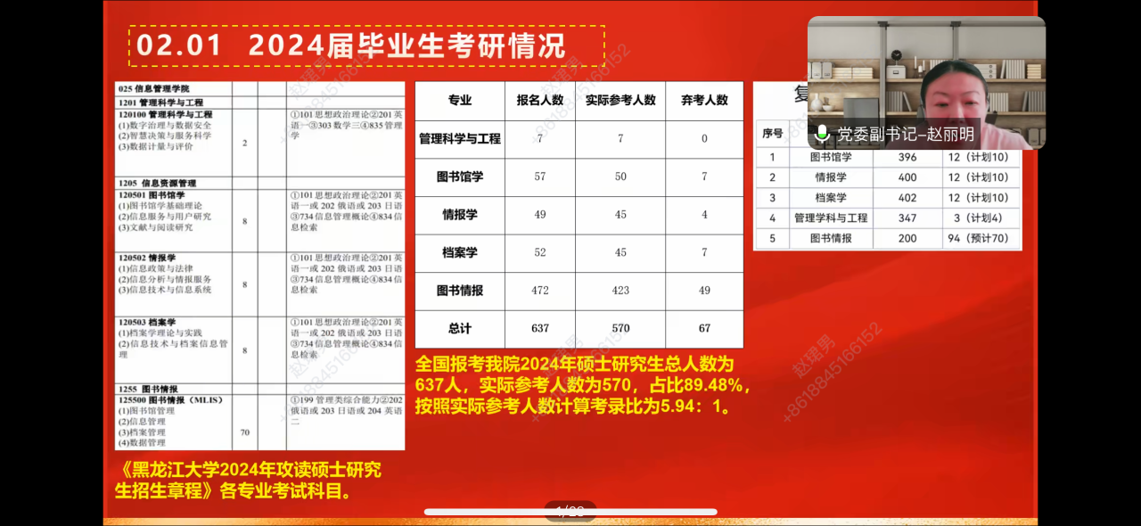 赵丽明副书记首先向家长介绍公司“协作发展,创新求实,德美勤勉”的院训,展示院徽的设计理念,并详细介绍了学院学科与专业建设的具体情况。随后结合公司2024届毕业生就业情况和2023级硕士研究生生源数据,分析了本科生升学率存在的问题,鼓励2024级新生尽早确定合理的考研目标,并做好充分的备考准备。接着结合申请入党的程序和条件,开展了入党启蒙教育,为同学们提供了明确的指导方向。