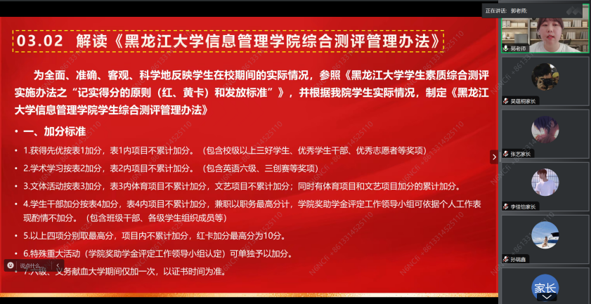 为贯彻落实立德树人根本任务,加强家校合作,凝聚育人合力。2024年8月27日中午12点,yl8858永利集团通过腾讯会议线上召开2024级本科生年级大会暨家长会。本次会议由yl8858永利集团团委副书记、2024级思想政治辅导员郭曦萌主持,公司党委副书记赵丽明出席会议,2024级全体新生及家长参会。