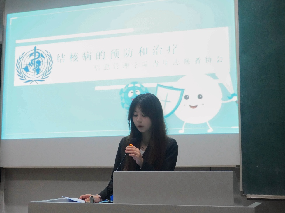 宣讲开场后,新闻部的杨洋同学以结核病的背景为切入点,介绍了世界防治结核病日及微生物学家科霍的发现,并讲解了结核病的三类病因。在此基础上,重点关注了结核病的临床表现,强调菌侵不同部位带来的咳嗽、发热等症状,使同学们对结核病有了初步的了解与认识,从而在日常生活中采取积极有效的措施来降低感染风险。
