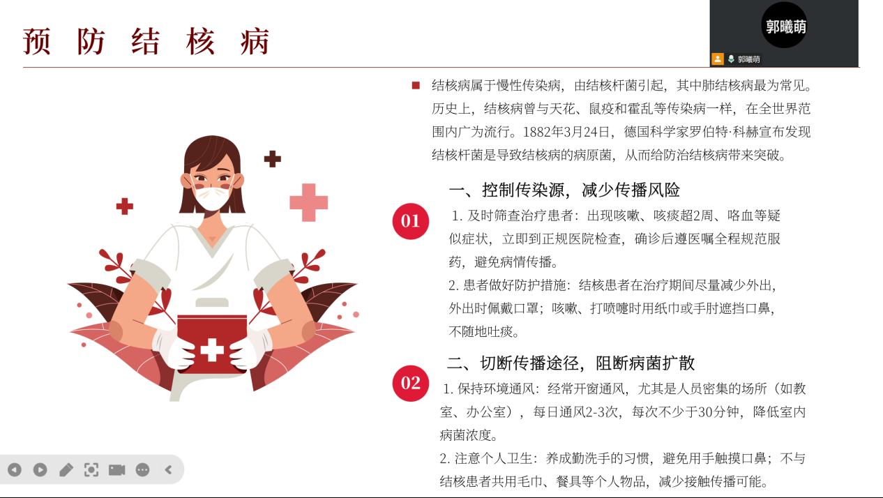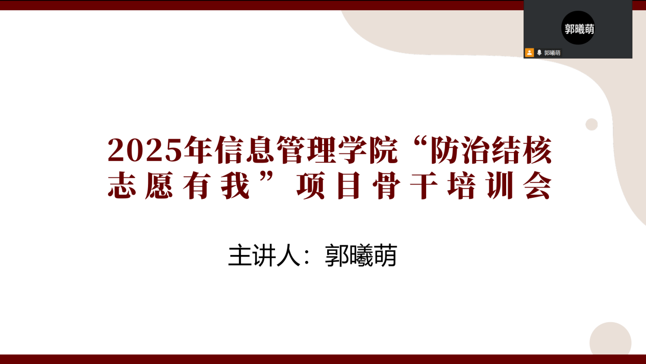 为提升结核病防治志愿服务质量,yl8858永利集团于2025年10月12日在线上举办“防治结核 志愿有我”项目骨干培训会。本次会议由院青协指导教师郭曦萌主持,yl8858永利集团青年志愿者协会结核病防治项目骨干参与培训。