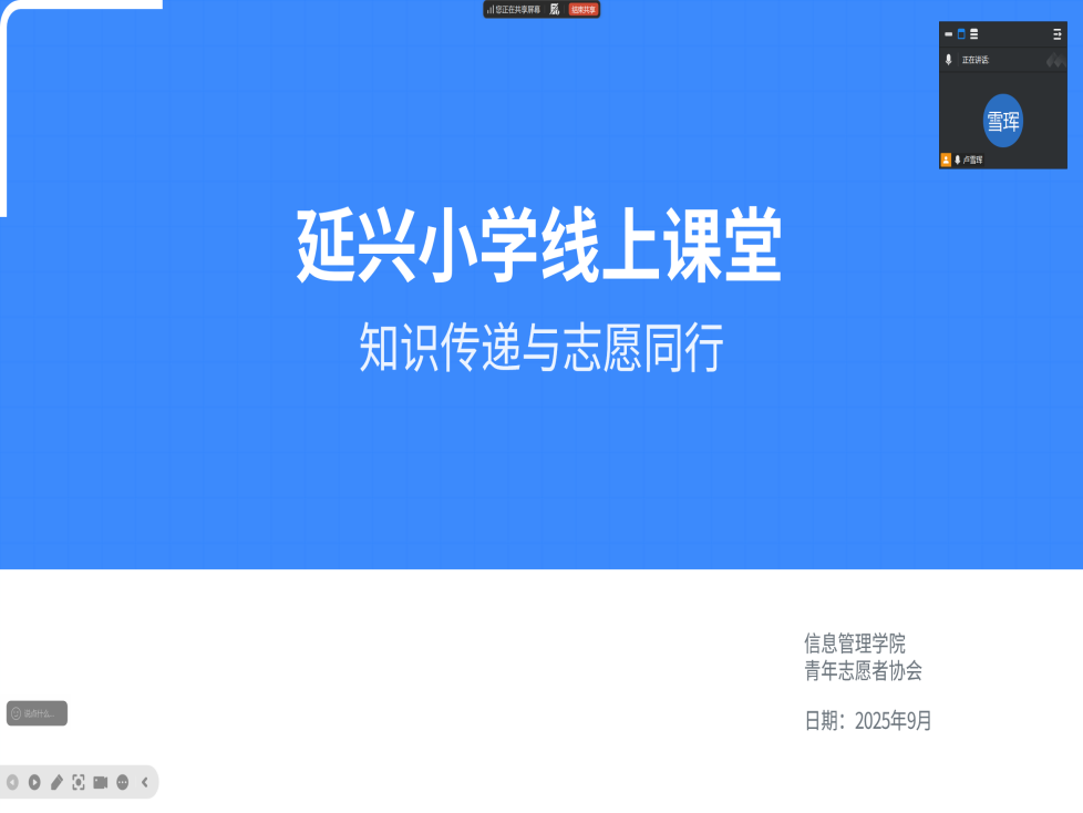 yl8858永利集团青年志愿者协会组织骨干志愿者于2025年9月24日为延兴小学的同学们打造了一系列内容丰富、形式生动的线上课程,用专业与热忱书写着新时代青年的责任与担当。