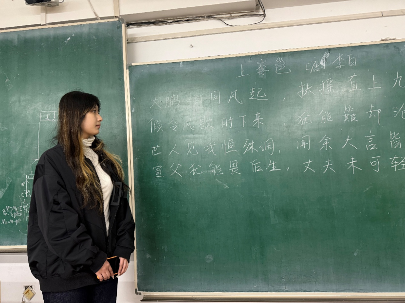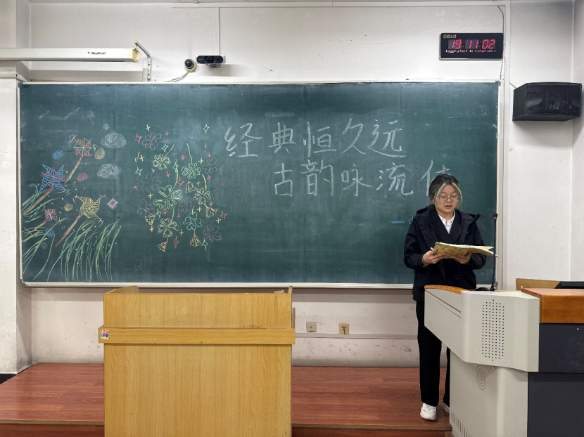 诵读现场,同学们整齐起立,目光澄澈而坚定。当“大鹏一日同风起”的诗句响起,清亮的嗓音汇聚成昂扬向上的力量,在教室中久久回荡。从“扶摇直上九万里”的壮志豪情,到“犹能簸却沧溟水”的坚韧从容,再到“丈夫未可轻年少”的青春宣言,每一次诵读都饱含着对先贤的敬仰,更传递出当代信管学子不负韶华、勇担使命的赤诚之心。
