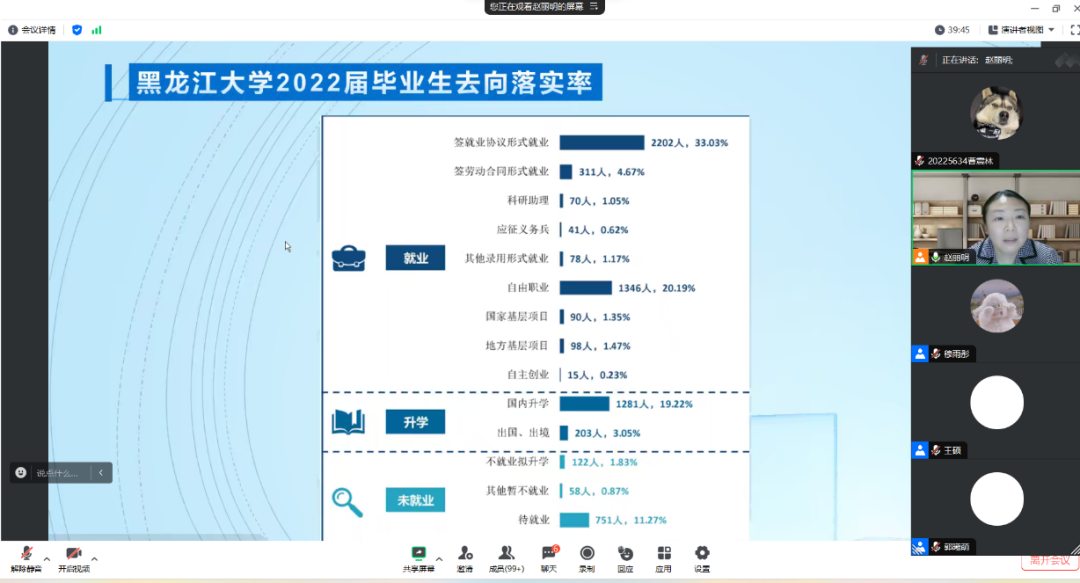 会议伊始,赵丽明老师从学院近三年毕业生就业情况、毕业生去向、生源地就业三方面着手,结合公司2022年毕业生就业质量年度报告以及各省份城市录用榜单等数据,整体分析公司就业形势。对近期各省公务员联考、选调生和事业单位招聘考试进行解读,对非黑龙江生源、选择回生源地就业的毕业生就业进行具体指导,指出要充分利用年前年后时间,及时收集当地岗位招聘信息,积极参加当地线下招聘会。赵丽明老师强调,毕业生就业是关系个人、家庭和社会的民生工程,毕业生要不断着眼于社会大趋势,结合自身实际理性做出就业选择。