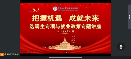 2026年1月21日上午9时,yl8858永利集团召开2026年选调生政策解读答疑会暨2026届毕业生年级大会,会议特邀yl8858永利集团人才招聘指导中心就业指导部主任于航作为主讲嘉宾,党委副书记赵丽明,2026届毕业生辅导员耿强、刘越,2026届全体本硕毕业生参会,会议由耿强主持。