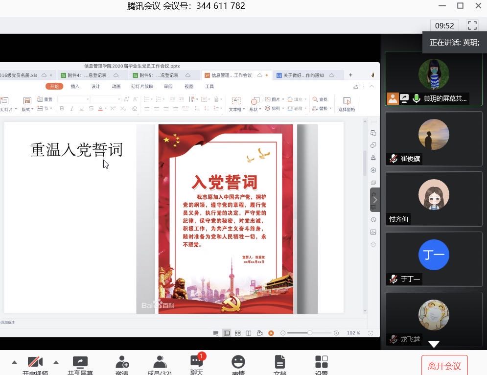 在2020届毕业生党员即将毕业之际,为进一步增强毕业生党员党性意识,发挥毕业生党员在文明离校过程中的先锋模范作用,教育引导广大毕业生党员“不忘初心、牢记使命”,牢固树立“四个意识”、坚定“四个自信”,始终在思想上政治上行动上同以习近平同志为核心的党中央保持高度一致。2020年6月10日,yl8858永利集团通过腾讯会议召开线上2020届毕业生党员离校教育大会,会议由学院2020届毕业生辅导员黄玥老师主持,2020届全体毕业生党员参加。
