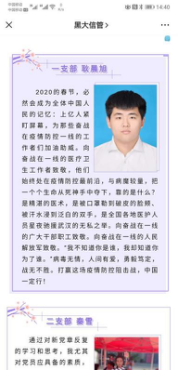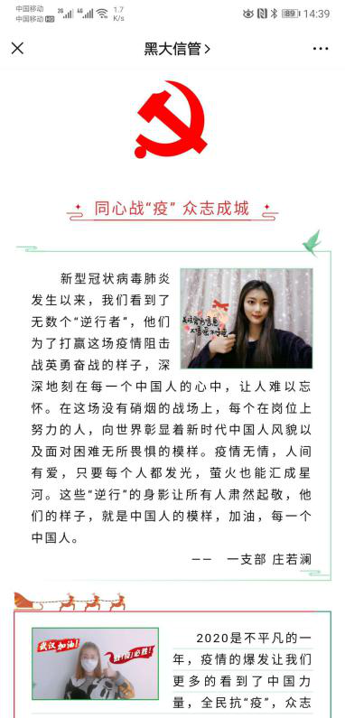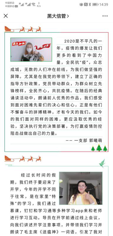 公司自3月8日起,辅导员和员工党支部书记分别通过线上平台组织员工党员上一堂“云党课”,带领员工党员集体进行经典诵读,并将员工党员对党课和经典诵读内容的感悟在学院微信公众平台“黑大信管”进行同步宣传和展示。云党课以“众志成城同战疫·青春共话爱国情”为主题,带领全体党员同学深入了解疫情下党和国家的作为,走近一线奋斗者,了解在疫情下从个人到组织的付出与担当。