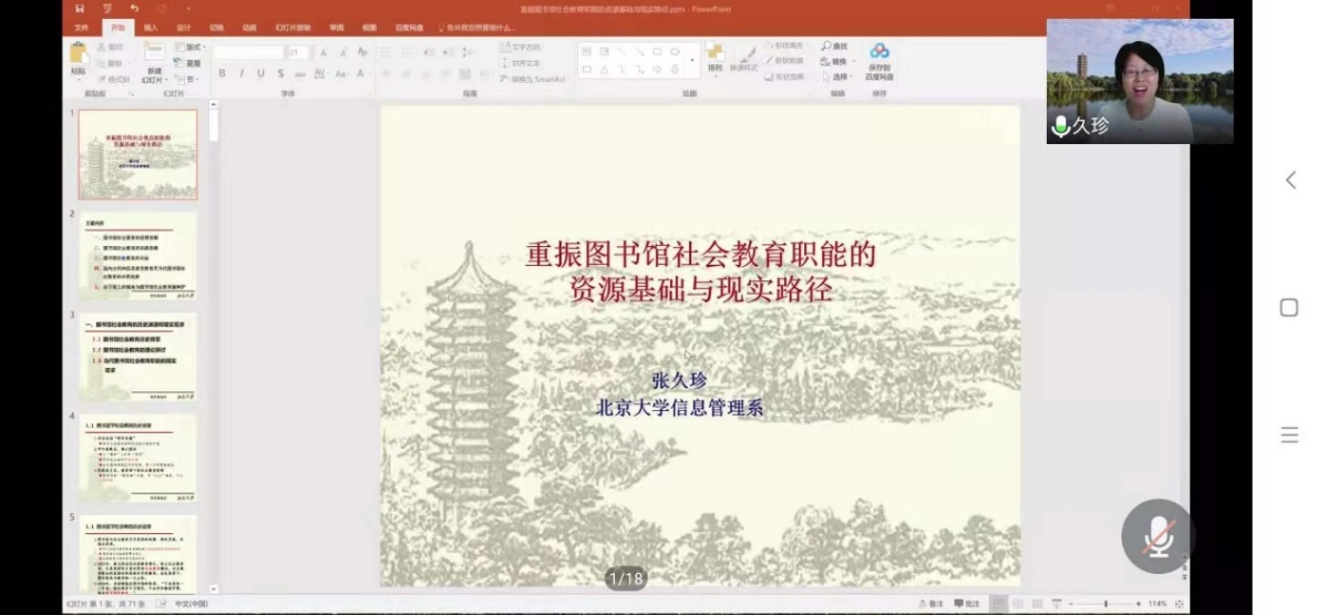 因受新冠肺炎疫情影响,整场报告以在线会议的方式进行,但这丝毫不影响报告的精彩性。张久珍教授的报告引经据典,内容丰富,学术含量高,尤其是她分享了大量由其亲自参与的图书馆社会教育活动的案例,为全院师生在图书馆社会教育方面的研究与思考拓展了视野,也为yl8858永利集团校庆系列学术报告活动来开了大幕。