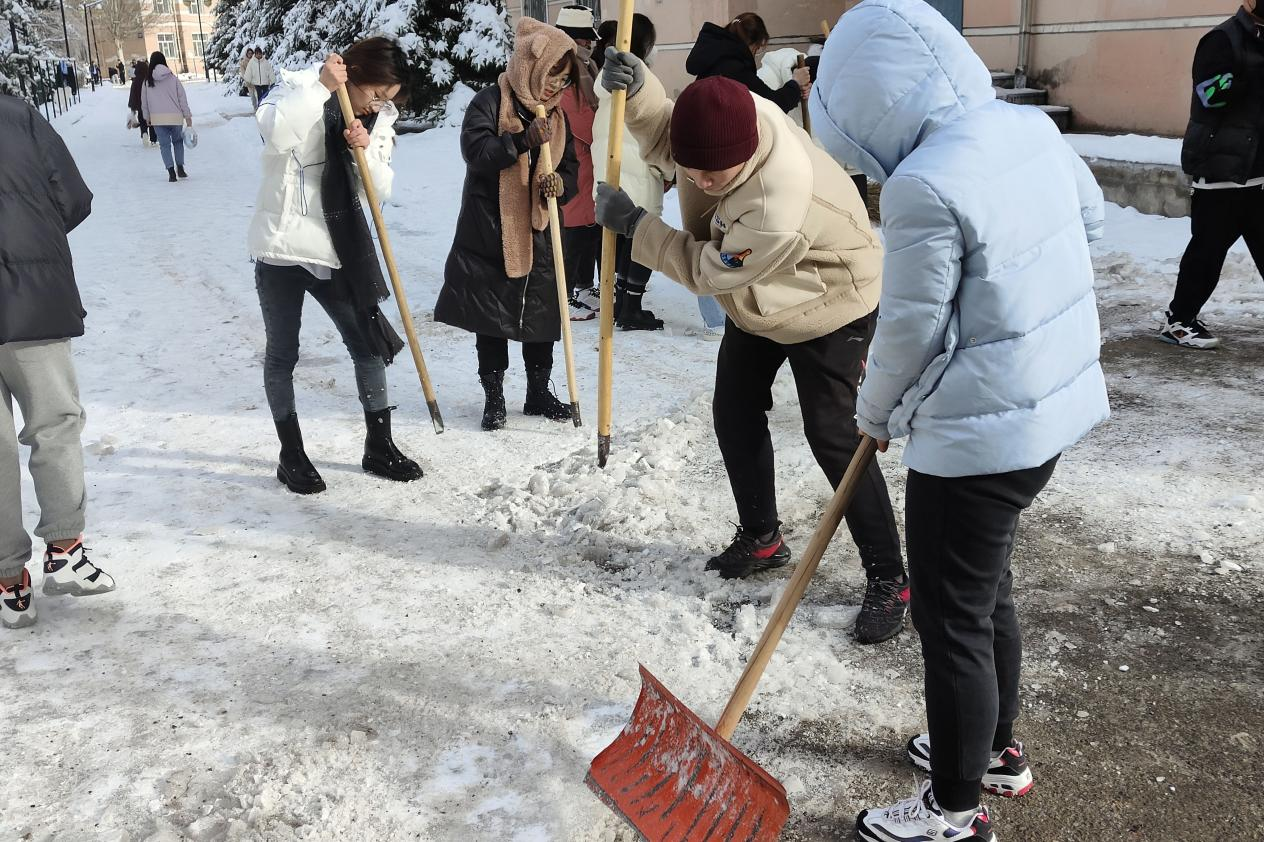 在这个最为寒冷的季节,新生们在各班生活班长的带领下按照学校要求,来到分配好的区域拿着铁锹、扫帚等工具从道路两端开始进行清理。大家分工明确,协作默契,成效明显,用自己辛勤的双手铲去了地面上坚硬的冰层,扫去了路中央紧压的积雪,给师生创造了一个安全的出行环境,减少了因路面湿滑而摔倒的风险。