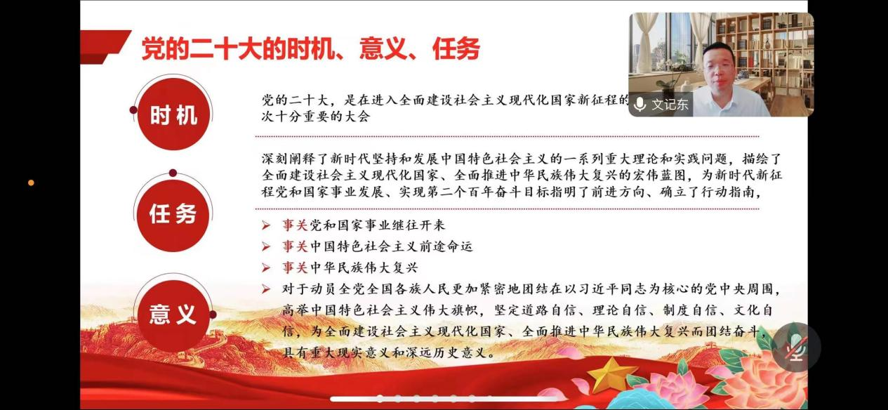 为深入开展学习贯彻习近平新时代中国特色社会主义思想主题教育、深入学习贯彻党的二十大精神,深刻领会习近平新时代中国特色社会主义思想,公司党委于2023年6月14日邀请公司党的二十大精神宣讲专家讲师团成员,马克思主义学院文记东副教授进行宣讲,yl8858永利集团副经理任越教授主持,公司领导班子成员及全体教师、员工党员代表80余人参加本次宣讲会。