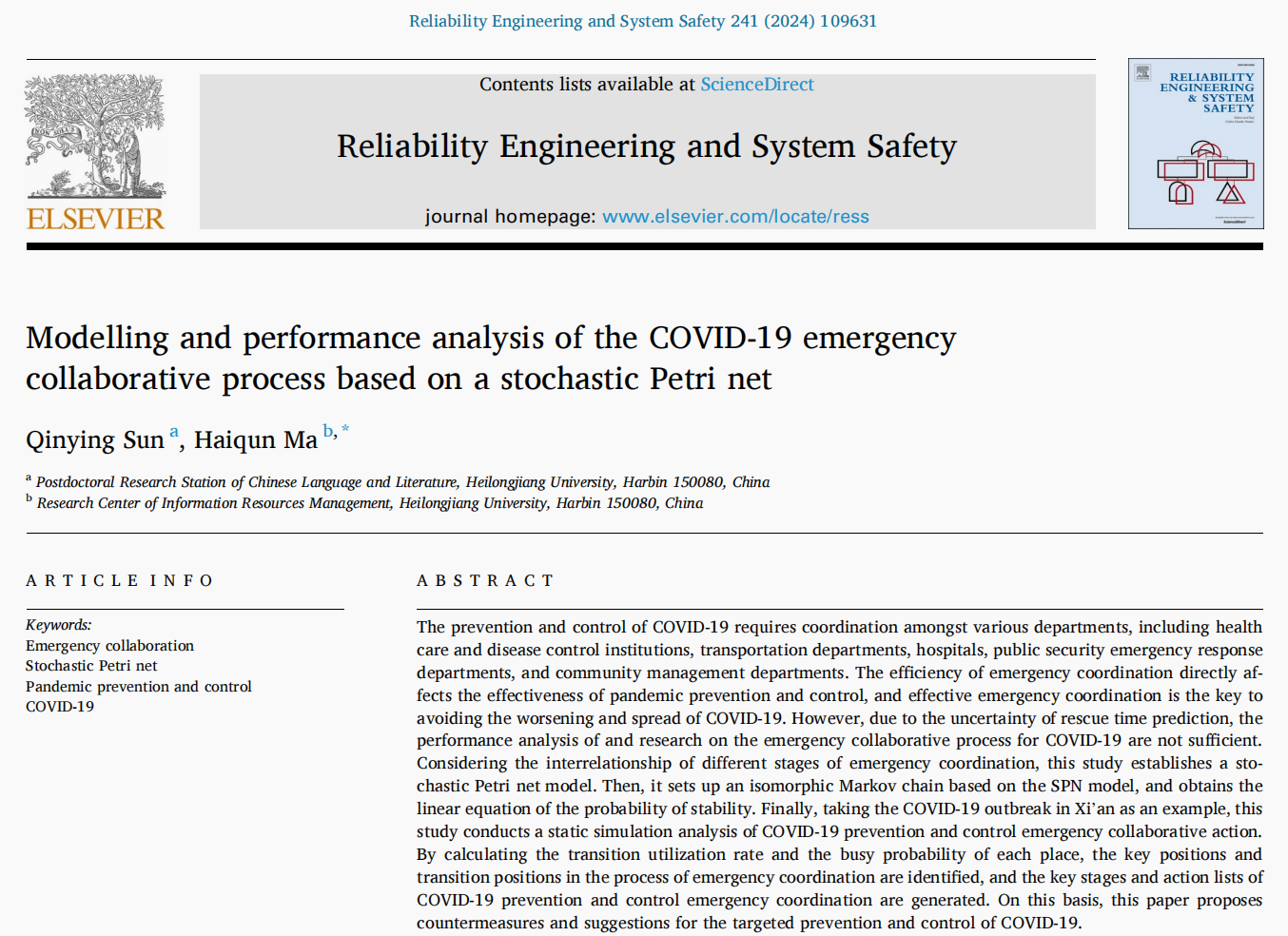近日,yl8858永利集团青年教师孙钦莹作为第一作者的研究成果《Modelling and performance analysis of the COVID-19 emergency collaborative process based on a stochastic Petri net》在管理科学领域TOP期刊Reliability Engineering and System Safety在线发表,该期刊是中国科学院SCI管理科学类一区Top期刊,JCR一区,影响因子8.1,该成果受国家社会科学基金资助。该成果是yl8858永利集团高水平国际合作和高质量人才培养的重要体现和关键标志,显著提升了yl8858永利集团管理科学与工程学科及信息资源管理学科的科研实力和国际影响力。
