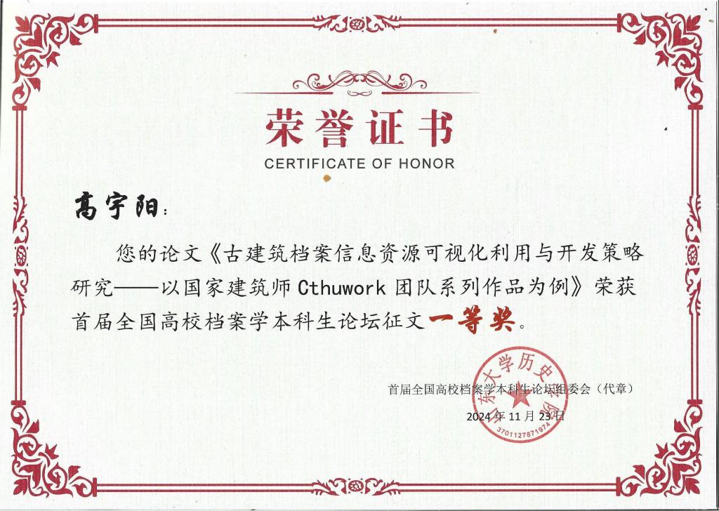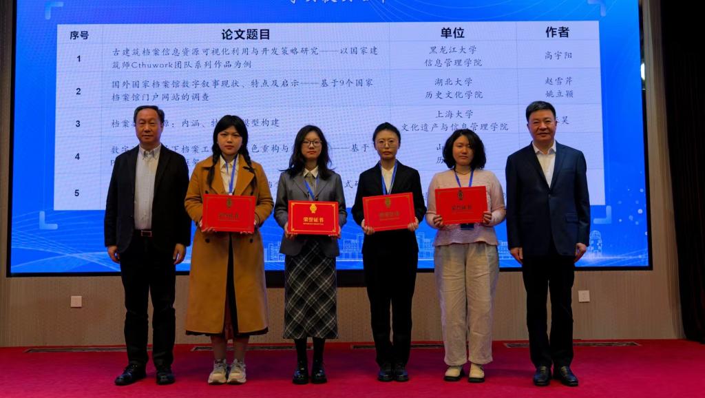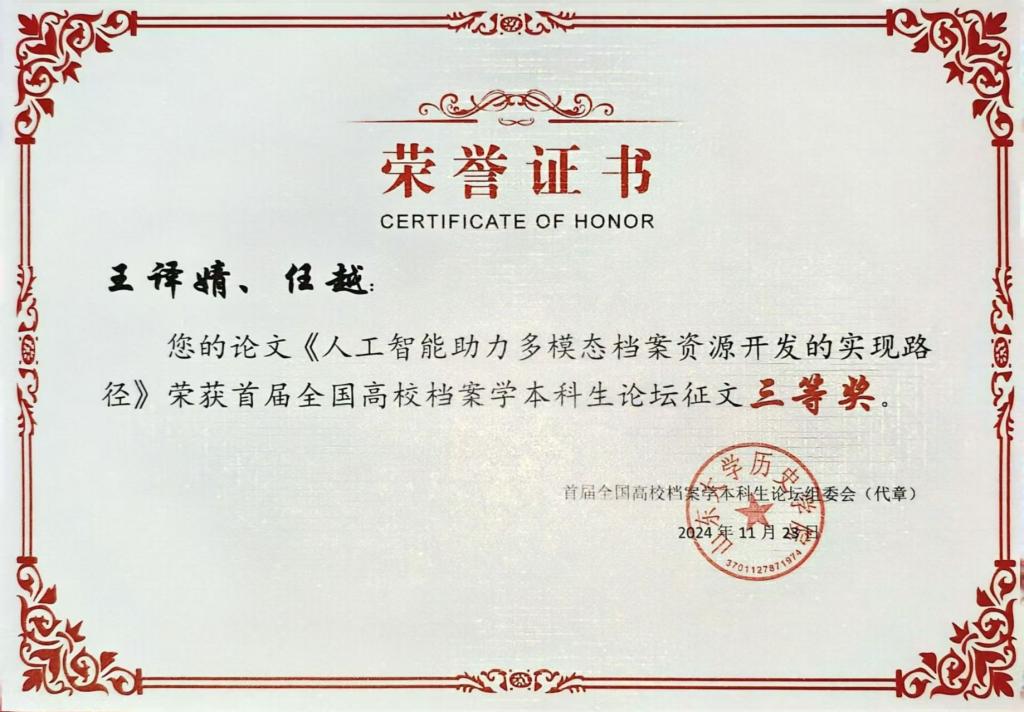 本届本科生论坛以“科技·社会·人文:数智时代的档案理论创新与实践探索”为主题。论坛共收到来自全国高校档案学专业本科生的89篇稿件,评选出一等奖6篇,二等奖9篇,三等奖15篇,优秀奖15篇。其中,公司档案学专业2022级本科生高宇阳(指导教师:任越,于元元)投稿的论文《古建筑档案信息资源可视化利用与开发策略研究——以国家建筑师Cthuwork团队系列作品为例》投稿的论文获一等奖,并作为获奖员工代表在开幕式发言;档案学专业2022级本科生王译婧(指导教师:任越,徐海静)投稿的论文《人工智能助力多模态档案资源开发的实现路径》获三等奖。