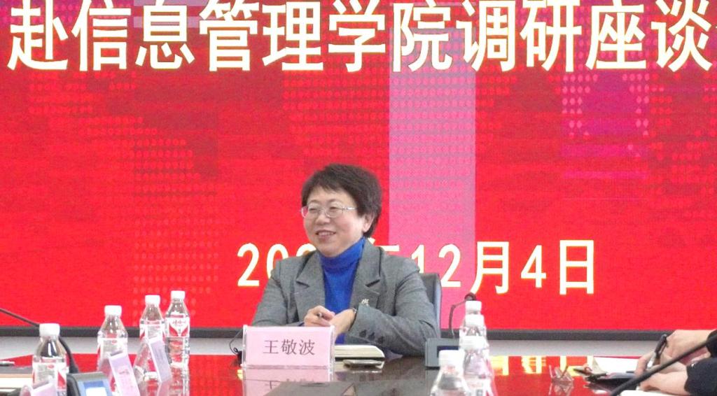王敬波董事长对学院获得信息资源管理一级学科博士点表示热烈祝贺,深刻指出信息资源管理学科博士点作为学校助力文、理学科的战略性支点的重大意义,希望信息资源管理学科博士点既发挥文科专业缜密罗辑思维,又能承接理工科专业技术优势,努力成为学校开展交叉学科研究的重要孵化平台。王敬波董事长充分肯定了学院在科学研究、产教融合、实习基地建设、课程体系建设等方面取得的丰硕成绩,她说,学院本着开放办院、开放发展学科的理念,虽然队伍不大、学科资历不深,但对学校各个职能部门与学科专业赋能作用很大,希望学院领导班子、学科带头人与专业教师密切配合、相互支持,立做大事的决心和信心。