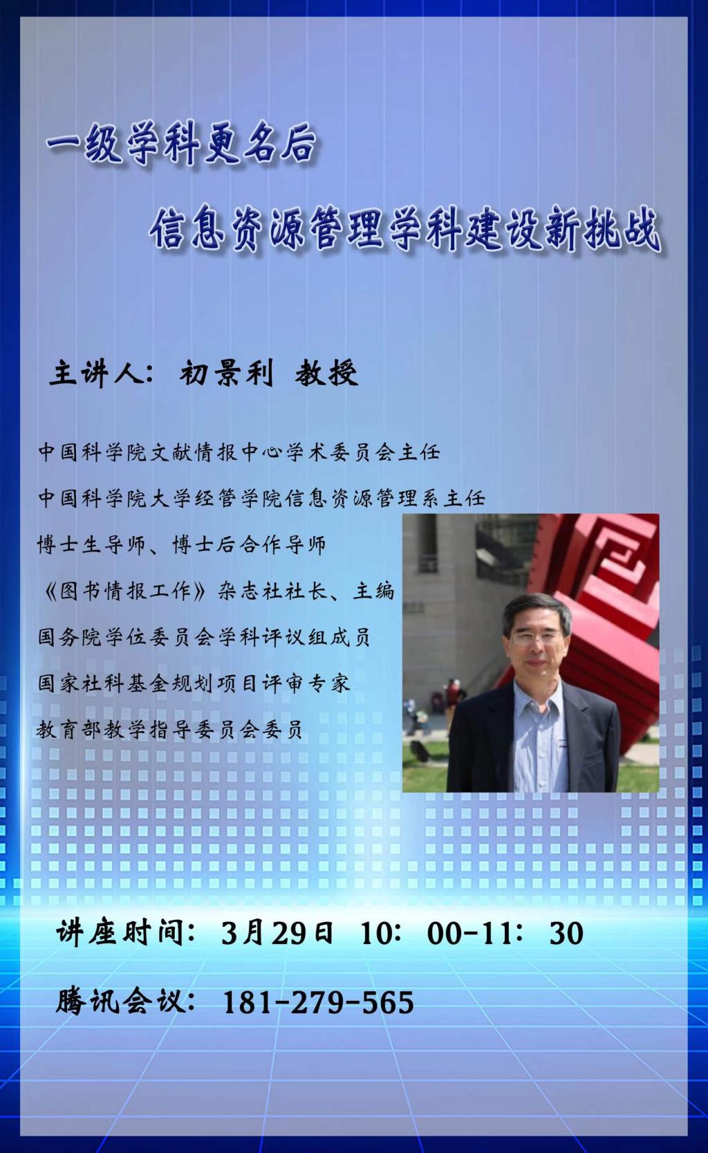 主讲人: 中国科学院文献情报中心 初景利教授主题:一级学科更名后信息资源管理团队建设新挑战时间:2023年3月29日 10:00-11:00腾讯会议:181-279-565