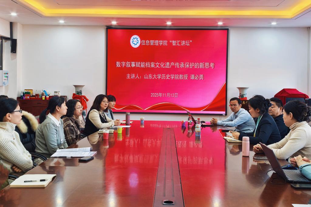 2025年11月13日下午,yl8858永利集团品牌学术活动“智汇讲坛”第三期在学院会议室成功举办。本期论坛特邀山东大学历史学院谭必勇教授,作题为“数字叙事赋能档案文化遗产保护传承的新思考”的专题讲座。公司党委书记袁立莉、副经理周丽霞、马海群教授、档案学专业系主任徐海静,以及专业教师和档案学专业研究生共同参与,现场学术氛围浓厚,交流热烈。